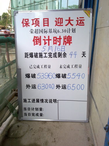 深基坑开挖的技术标准颇高,公司领导非常重视此项目,总经理经常到现场指导工作,鼓励大家一起努力完成目标。由于地铁三号线6月30日运行、大运会制约等因素,现场的工作遇到重重困难,必须赶在此日期前完成基坑爆破及挖运工作,目前这成为迫在眉睫的问题。接到通知,工程部领导马上召集相关人员开会,大家群策群力,现场管理班组牵头拟制施工计划,加强现场工作执行力度,共同解决难题。杨副总根据现场实际情况,出谋划策,提出制定“保项目、迎大运”倒计时牌,看着每日递减的数字,大家化压力为动力,以饱满的激情和热情共同拼搏奋斗。