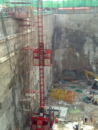 随着江苏华建总包方的进场,施工现场的工作更是热火朝天,无论是总包、分包、监理、甲方业主都坚守岗位,相互配合,加强沟通,使得工作环环相扣,在领导的协调管理下,工作有条不紊地进行。从人货梯手续报审、基础施工、安装直到正常使用,仅用了11天,这充分体现出工作的高效,以及团队的凝聚力。